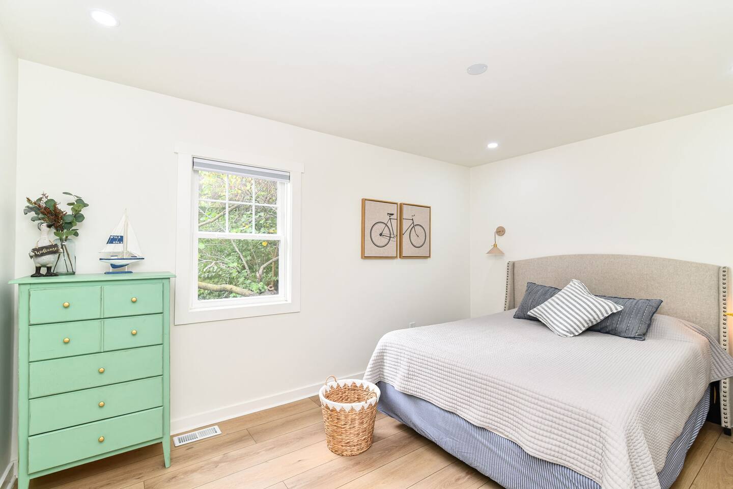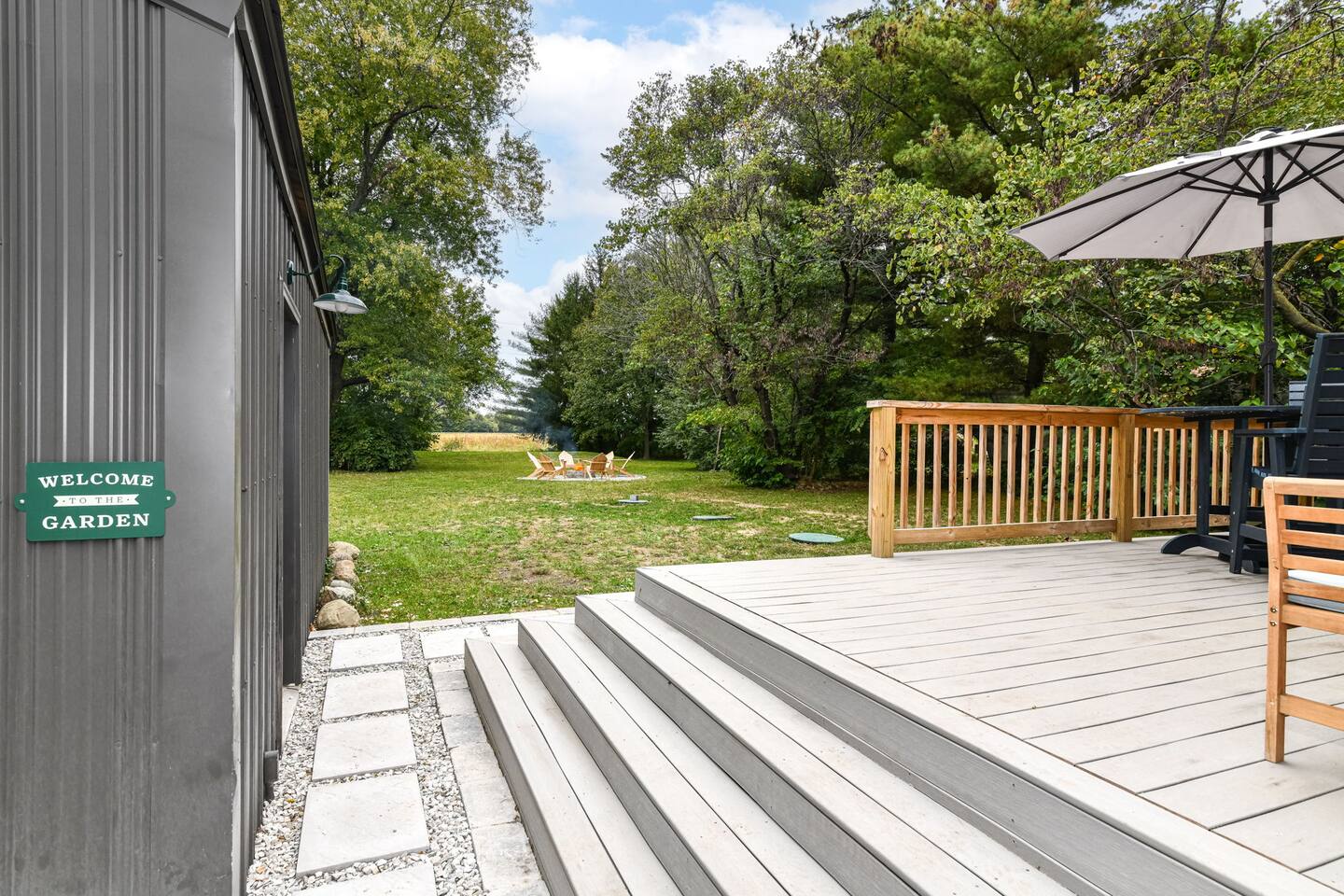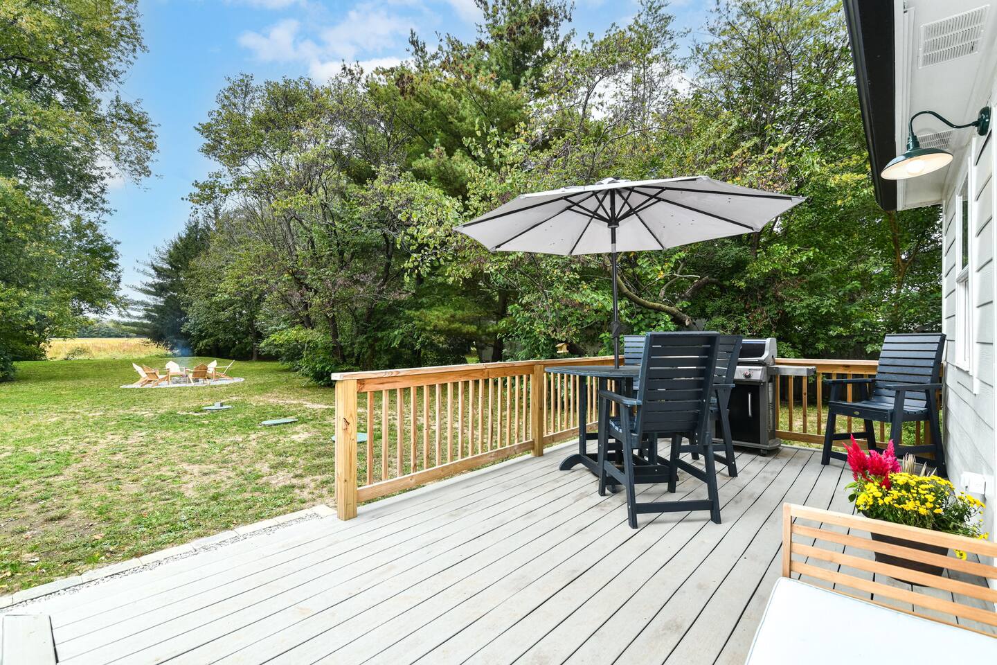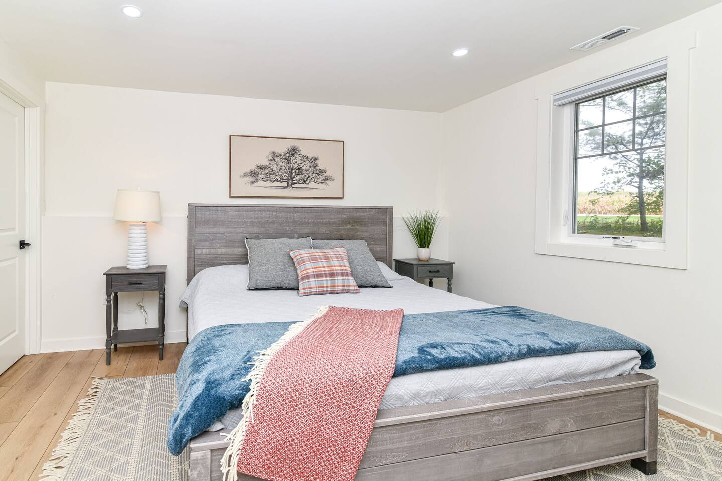 Relax with the whole family at Florence Cottage. Brand new home- quaint, quiet, and a great mix of country charm with stylish design. The house offers 4 bedrooms, 2 full bathrooms. The master suite has its own spacious master bathroom. Bedroom 2 and 3 are furnished with queen beds. Bedroom 4 offers a bunk bed. The home sits on an acre with stately mature trees, a fabulous front porch to take in the sunrise & then a new deck overlooking the large back yard boasting amazing sunsets at night!