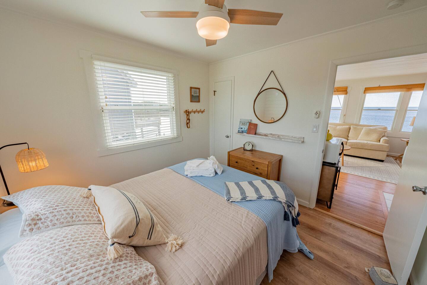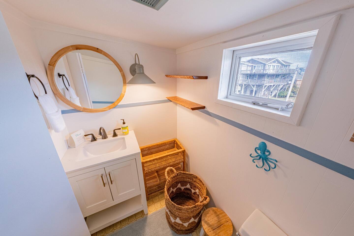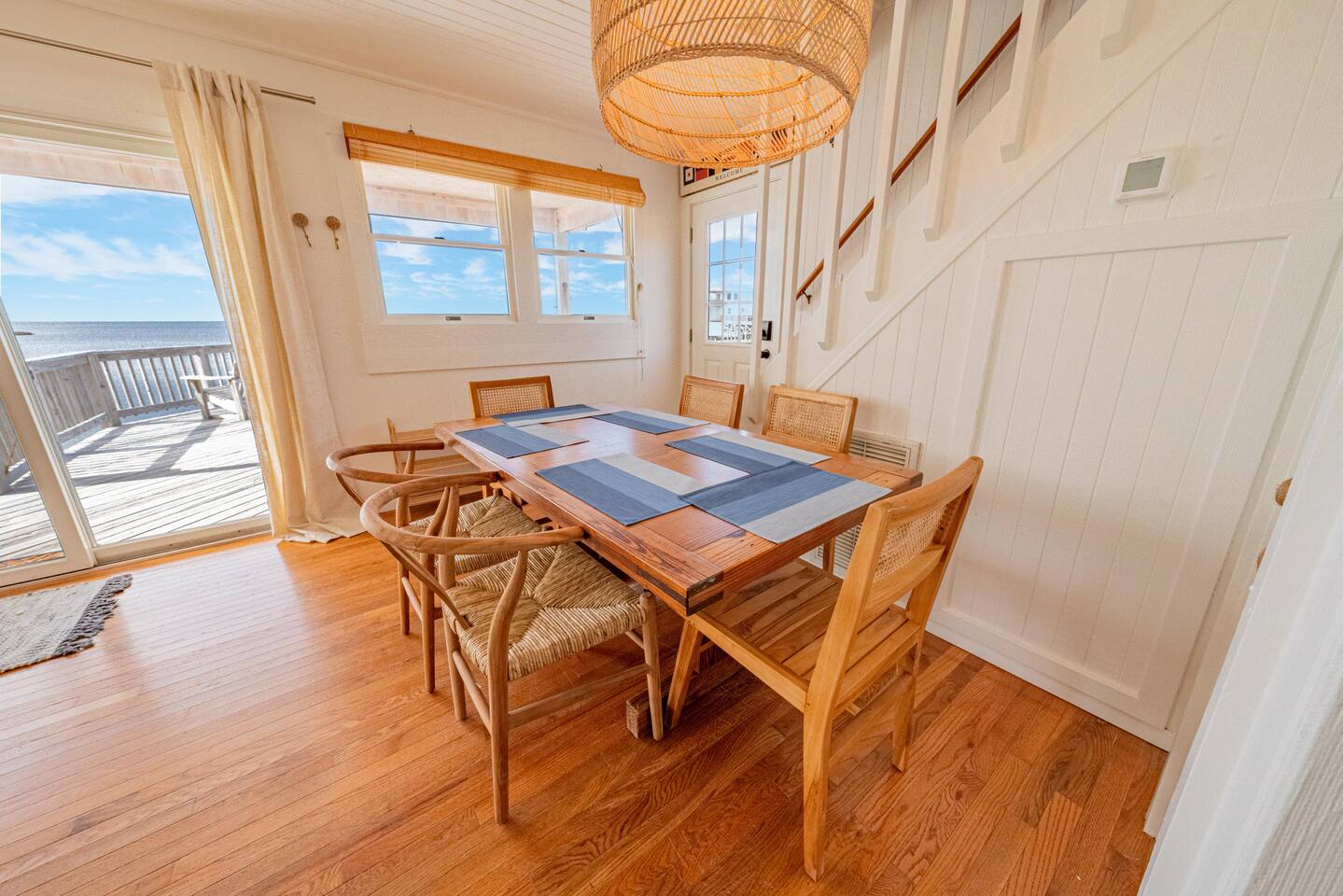 Step inside this freshly renovated home with an open floor plan and gorgeous views! This 3 bedroom, 2.5 bath cottage has a large expansive deck overlooking the Pamlico Sound. 2 bedrooms located on the main level offer a queen bed and a full bathroom in each. One bathroom offers a shower, while the other offers a bathtub/shower combo. Upstairs, you will find a playful bunk room with 4 twin beds, a pullout twin couch, and a 1/2 bathroom. There is a smart tv in the bunk room as well as one in the living room. Board games and books galore. The deck offers a hot tub, multiple lounge chairs to take it all in, and a picnic table underneath the covered porch. Down the patio steps you will find a heated outdoor shower, owners outdoor closet with 2 paddle boards, 2 kayaks, beach chairs, beach wagon, toys/games and a cooler. The water is fairly shallow and sandy just off the deck/pier so a good spot for swimming, playing in the water and launching your boards! Perfect spot for kite surfing and windsurfing too.